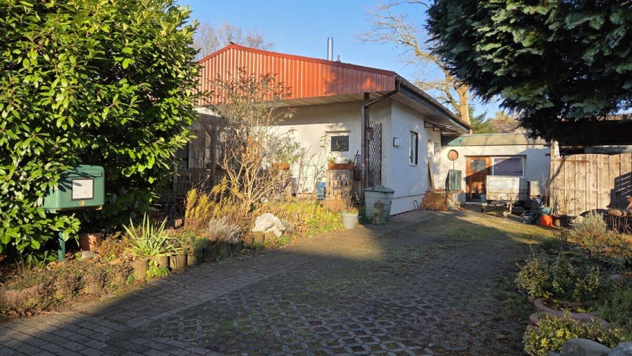 Der Außenbereich ist pflegeleicht und dennoch einladend gestaltet. Ihr Fahrzeug findet im Carport direkt am Haus Platz, sodass Sie Einkäufe schnell ins Haus bringen können. Die umgebaute Garage zu einer beheizten Werkstatt bieten weiteren Stauraum und Platz zum Heimwerken. Der Garten bietet genügend Raum für Entspannung und Gartenarbeit, ohne Sie in der Pflege zu überfordern - ideal für Menschen, die ihre Freizeit lieber genießen als mit schwerer Gartenarbeit zu verbringen. Die überdachte Terrasse mit dem Gartenhäuschen runden das Angebot der Außenanlage ab.
